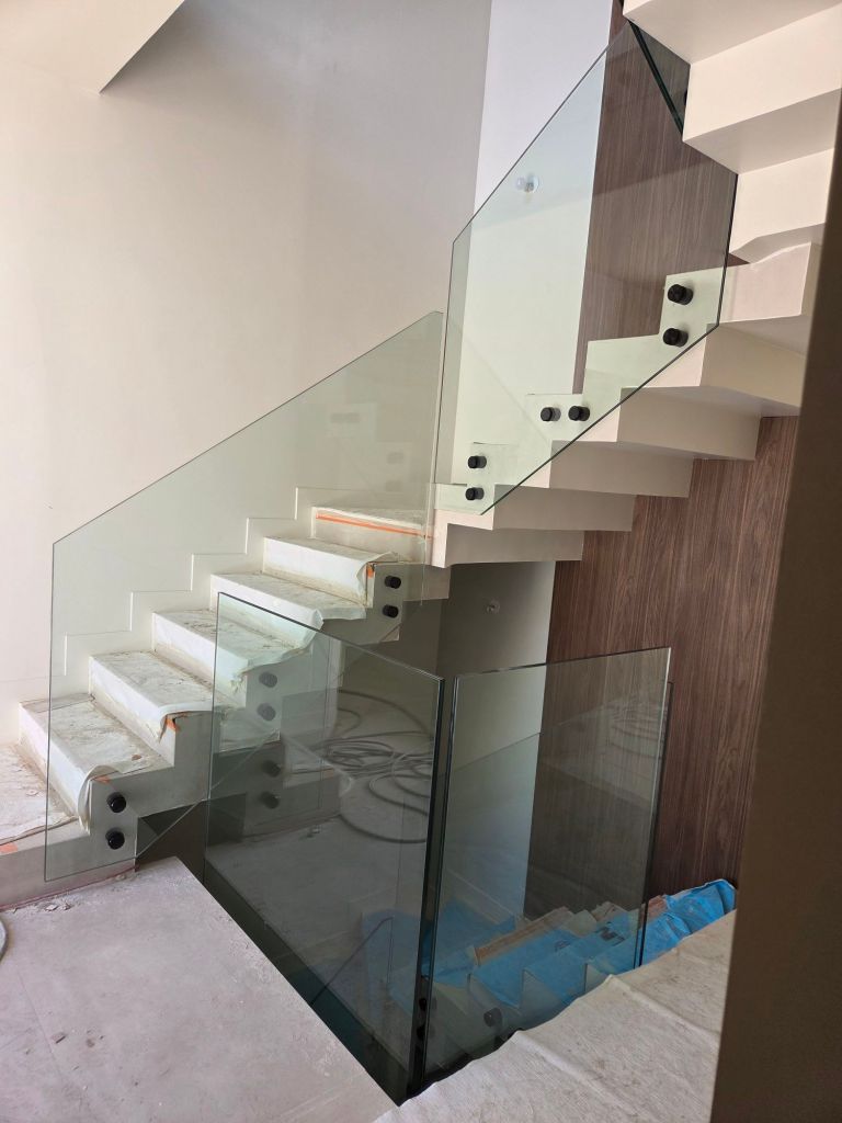 Découvrez notre dernière réalisation à Villeurbanne, dans une maison de standing aux finitions modernes. Deux étages de gardes-corps vitrés, fixés avec précision grâce à un système de fixation par points noirs discrets et élégants. Un design épuré, une installation soignée, pour un rendu à la hauteur des exigences les plus élevées. Offrez à vos espaces un équilibre parfait entre sécurité, transparence et esthétique.
