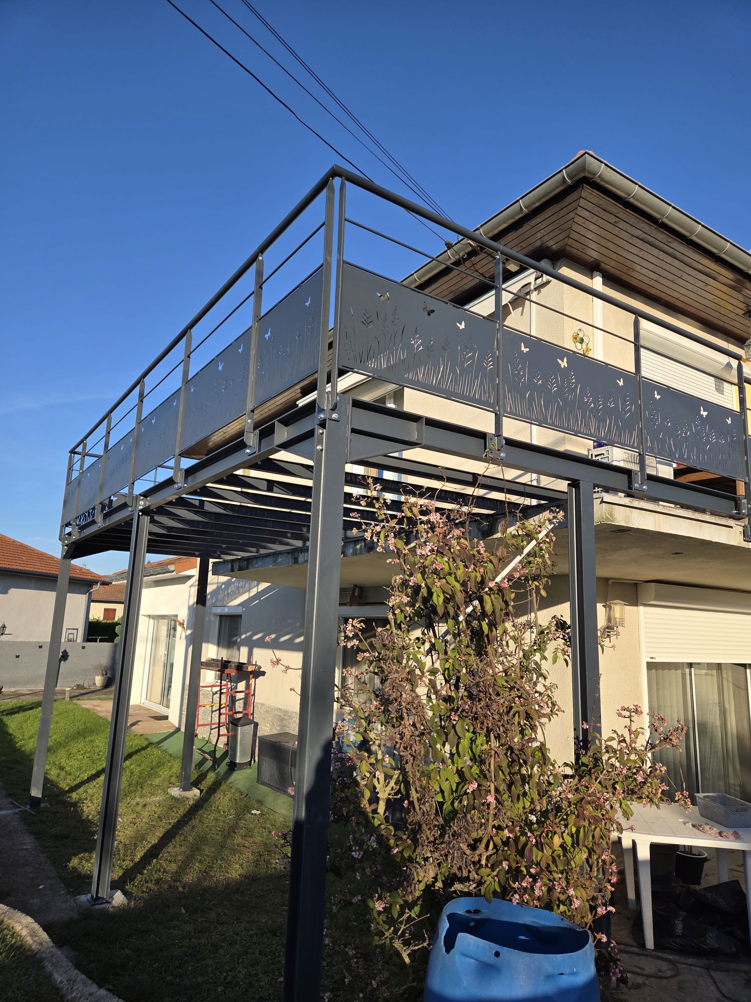 Cette terrasse sur mesure a été entièrement conçue et fabriquée dans notre atelier de Brindas. Réalisée en charpente métallique, elle apporte une ligne contemporaine à la maison tout en offrant un espace extérieur confortable et accueillant.